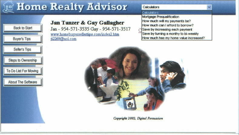 From this screen, the user is lead to a menu offering a choice of topics, help files and checklists for buying or selling a home. They can review various topics as well as using one of several calculators, including a complete mortgage calculator and amortization schedule and a mortgage qualification calculator.